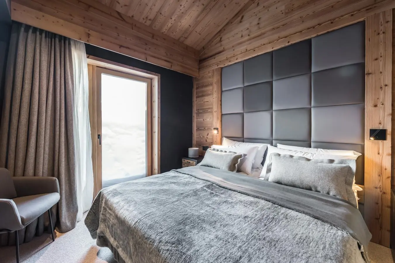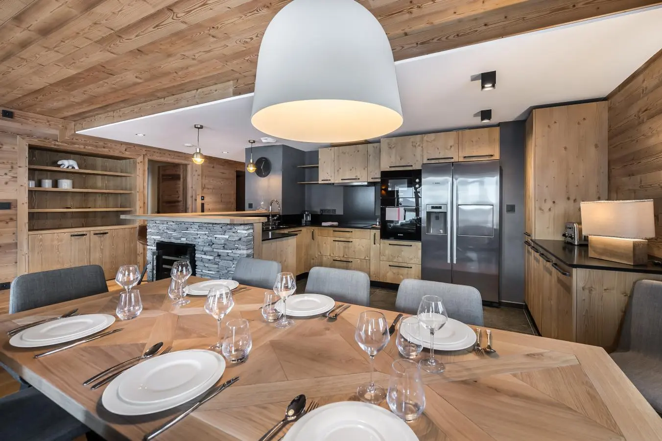 There are two separate balconies leading from the living area, offering beautiful views of the village of Val d’Isere and the famous piste ‘la face de Bellevarde’. Inside the layout is both comfortable and practical, with seating around the fireplace and large TV for relaxing in the evenings. The kitchen with breakfast bar is generously equipped (including a Nespresso machine and separate wine fridge) and leads conveniently to the dining area.
