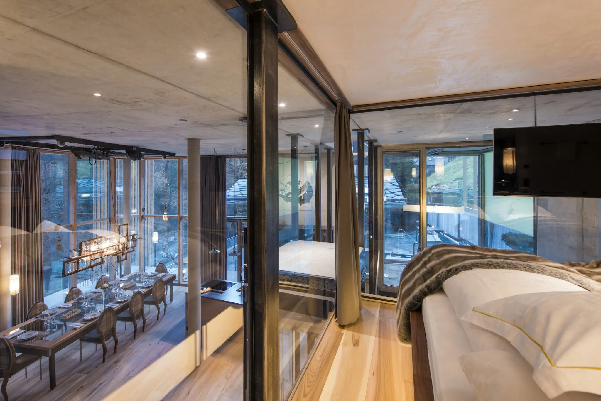 This 174m² apartment occupies the first floor of the building and comprises four well-sized, luxurious bedrooms, two with access to south-facing balconies with amazing views of the town and the famous Matterhorn. Fully equipped for all guest needs, the apartment features a sleek fitted kitchen with high-end Miele appliances and Nespresso machines. The main living area consists of an open plan living/dining/kitchen area, with a feature gas fireplace and large cosy sofas overlooking the lights of the village, and comes with cable TV for quiet evenings in. Bedrooms 1 & 2 feature luxurious Superking beds, while Bedrooms 3 & 4 can adapt to guest needs, being configured either as Superking doubles or alternatively twin beds; all have plenty of storage and areas to relax. The apartment also features three large bathrooms with showers or baths, and an additional separate WC, plus Miele washing machine and tumble dryer for guest usage.