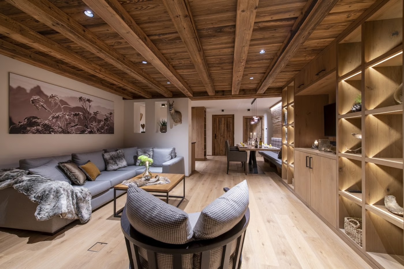 The living and dining area is a warm, welcoming space with views of the village and mountains beyond. A large L shaped sofa and stylish seating provide a sophisticated ambiance to enjoy a pre-dinner drink or relax and unwind.