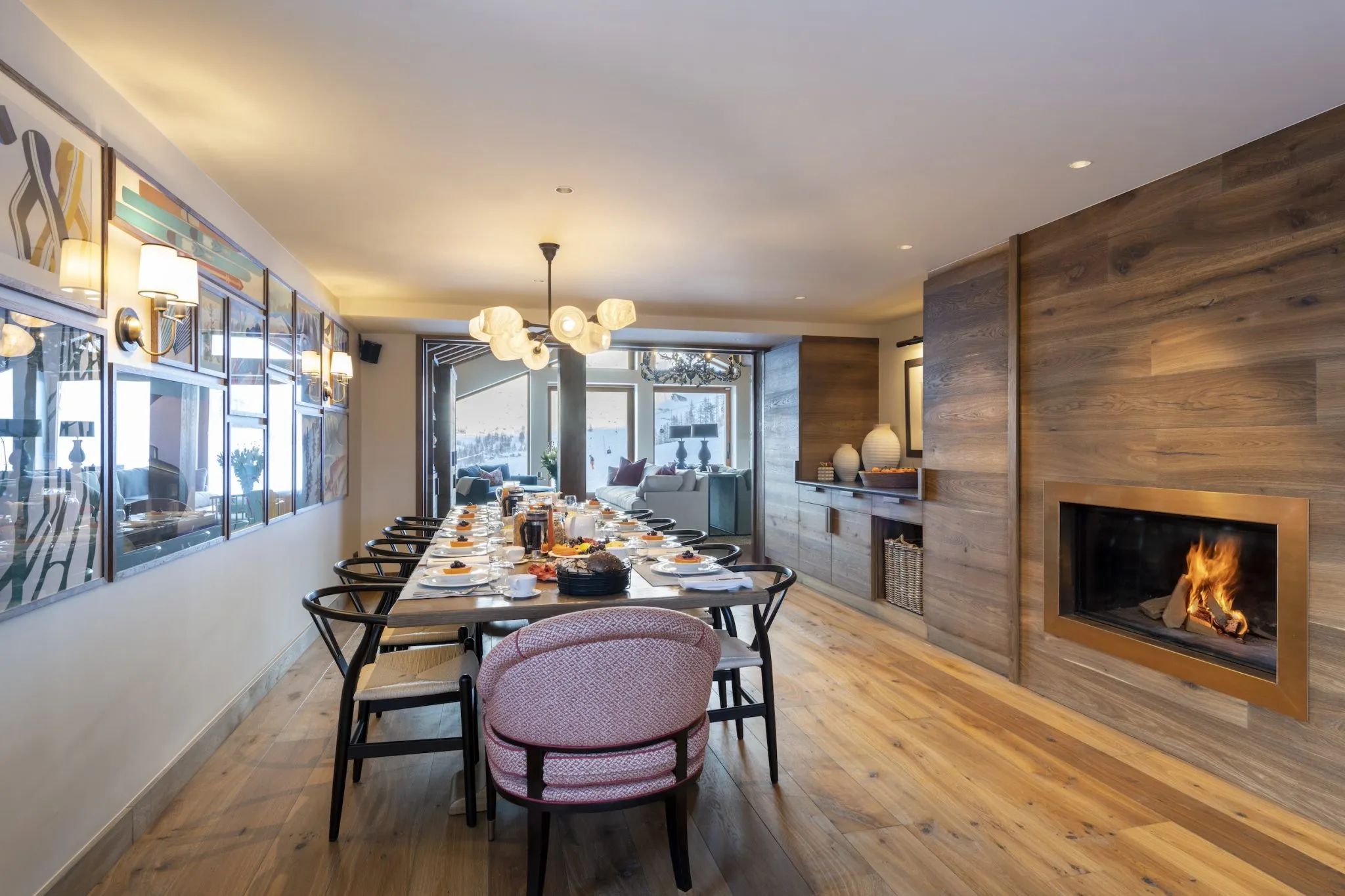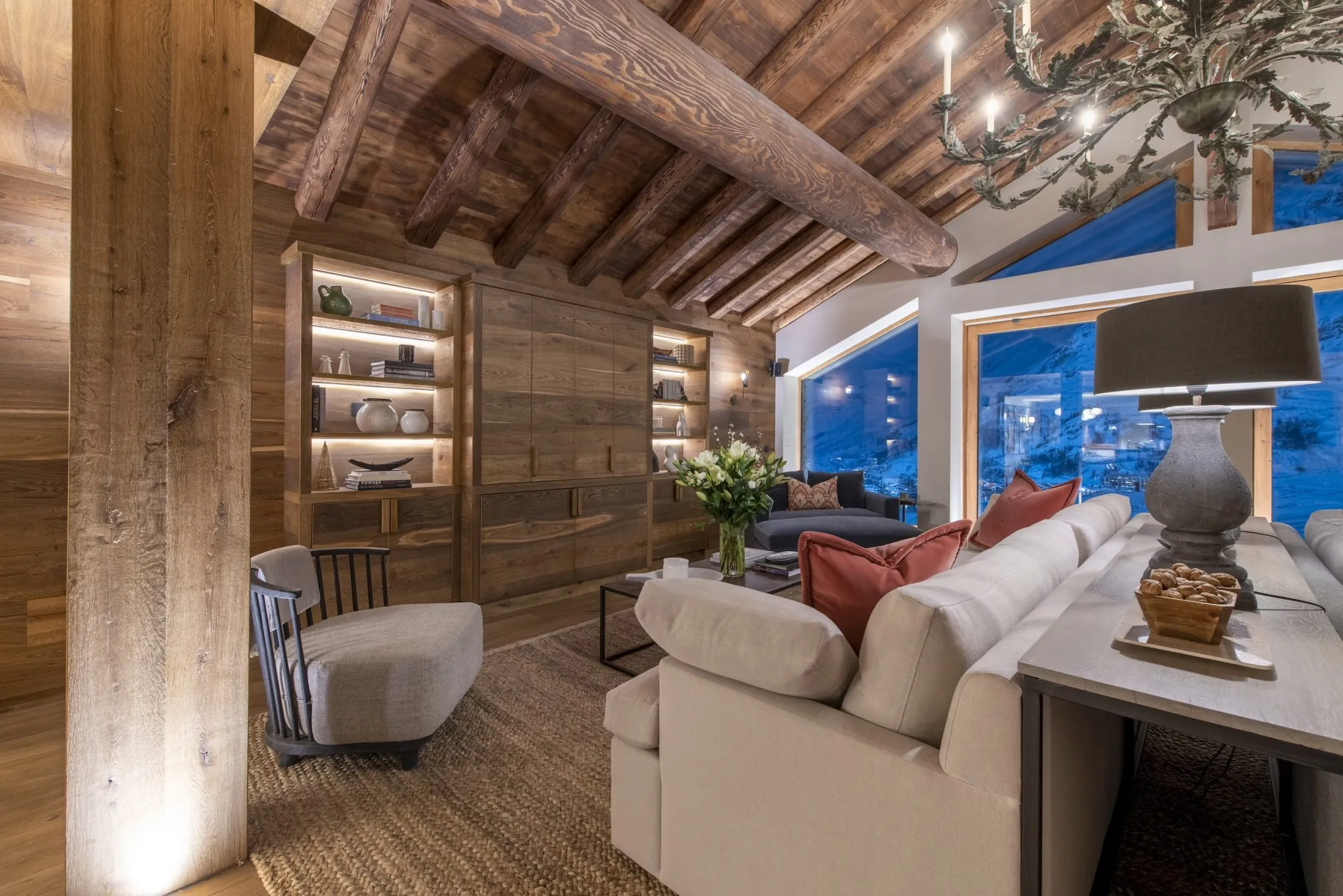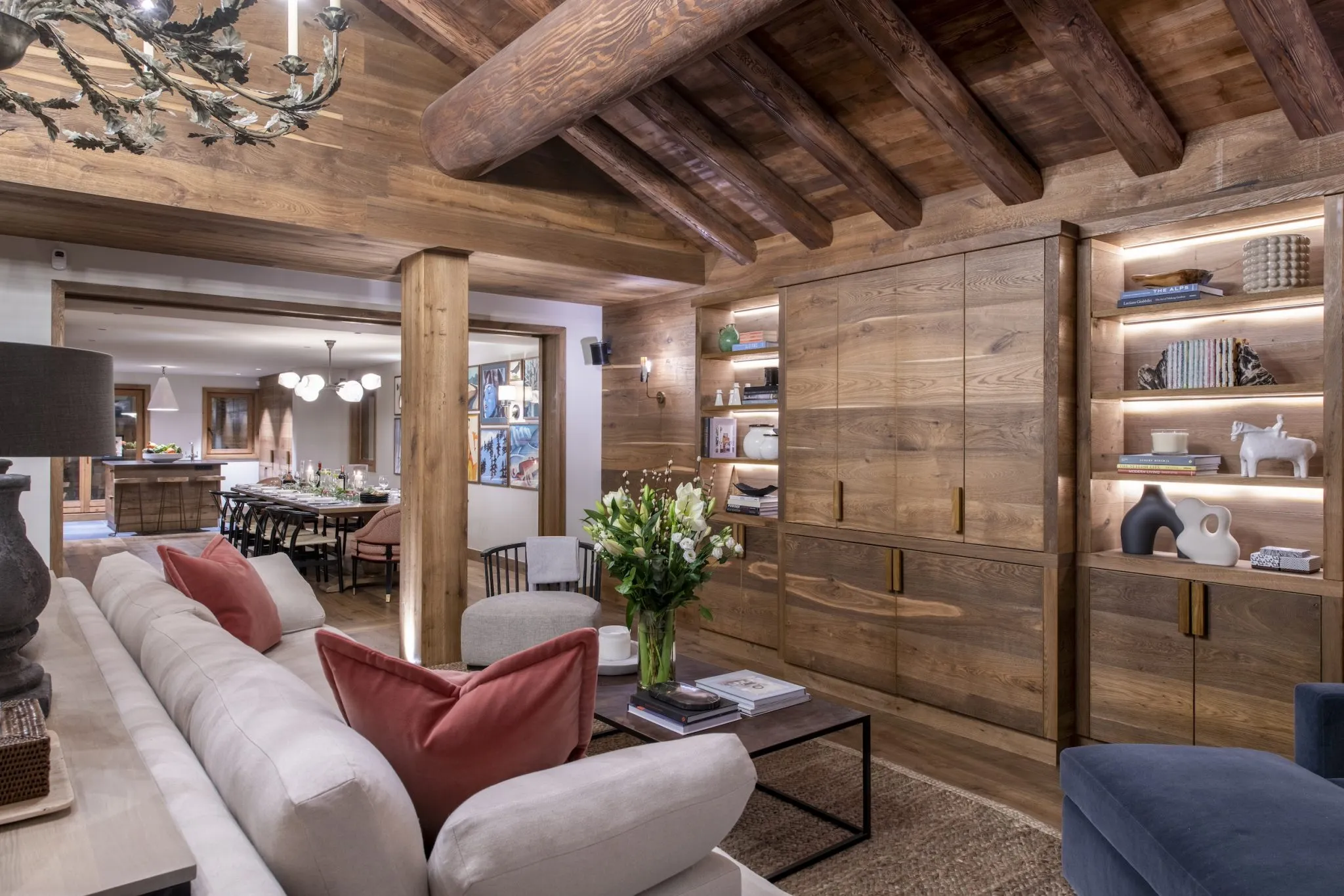 The first floor is dedicated to entertaining, with an open plan living, dining, and kitchen. The stunning living area, with double height ceiling, exposed beams, grand fireplace, and striking chandelier lighting giving a real wow factor. Two sumptuous sofas sit back-to-back; one side allowing you to hunker down in front of the fire and the other giving you the option to watch a movie. The room is flooded with light from the double-height windows, framing the impressive views of the mountains beyond. The views can be enjoyed from the balcony with your morning coffee or a glass of something sparkling after an exciting day on the slopes.