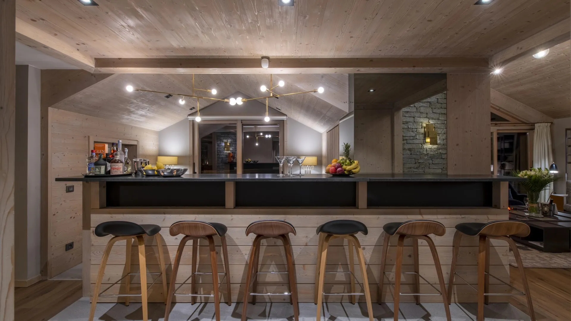 The five further bedrooms are found on the ground floor. There are three en-suite double bedrooms, and another bedroom which can be conveniently configured either as a twin or double. All are decorated with calming neutral alpine decor and have generous en-suites. Each room also benefits from access to either a shared or private balcony or terrace, allowing all guests to fully enjoy the spectacular views from the moment they awaken. The final bedroom is a double bunk bedroom which shares and en-suite bathroom with one of the double rooms, creating the perfect family suite.