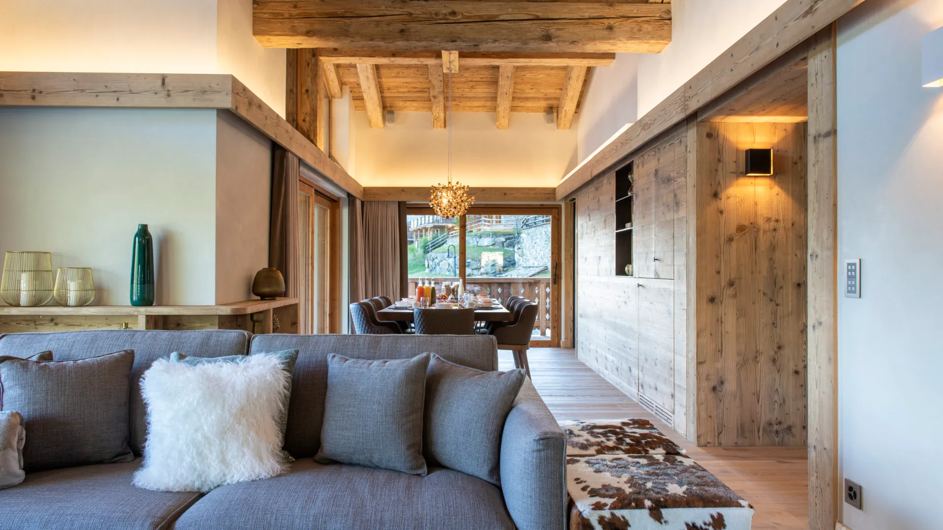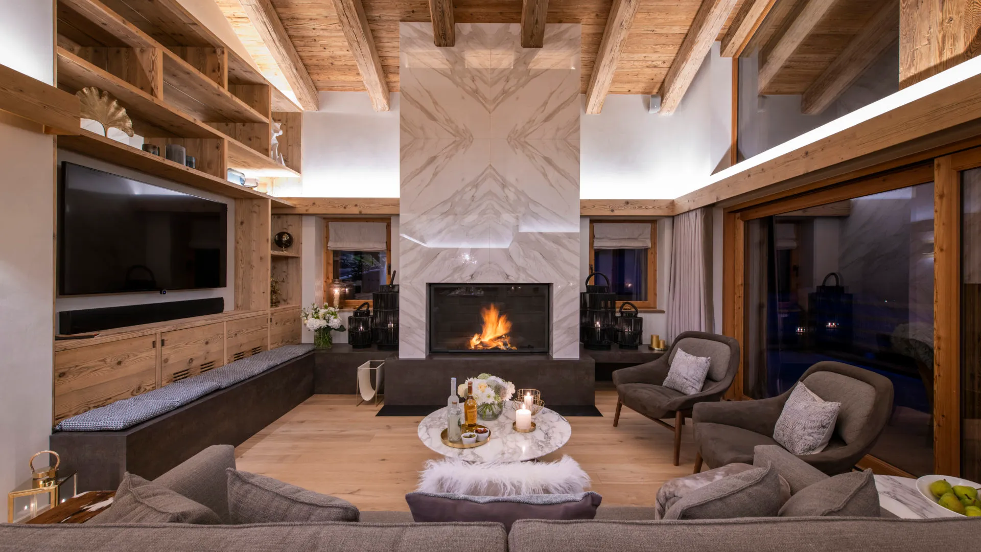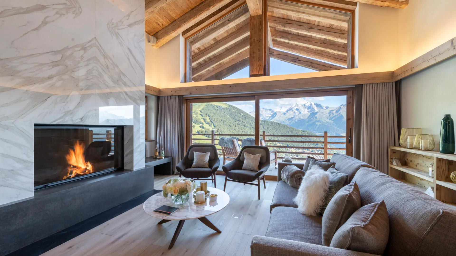 The living and dining area occupy the top floor of the chalet and take full advantage of the show-stopping views made possible by the chalet’s elevated position above Verbier. The open plan living and dining room stretch across the breadth of the chalet so that the views can be enjoyed between and during meal times. French windows allow abundant sunlight to bathe the entire room during the day. At night time, enjoy the shimmering lights of Verbier giving way to the moonlit majesty of the mountains beyond from the cosy comfort of your chalet. A wonderful wood-burning fireplace built into a solid marble column ensure a snug ambience and comfortable seating around it make it the perfect place to enjoy a glass of champagne or to curl up with a book.