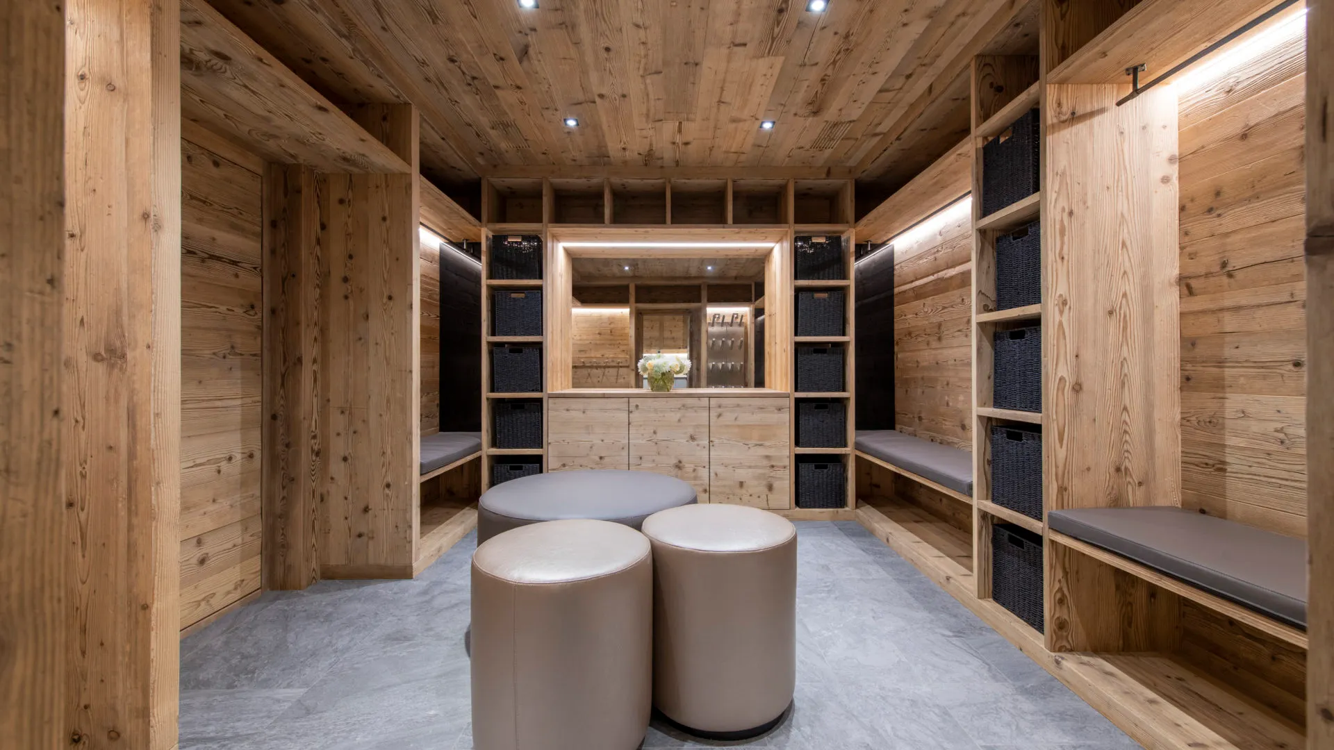 The extensive garage occupies much of the floor above, with space for four vehicles. There is also a spacious cinema room here, which can be used as a conference room if needed. In each case, the room has the capacity to seat up to 24 people. Also on this level is a sizeable ski room with plenty of storage and boot warmers. A laundry room is linked to this room.