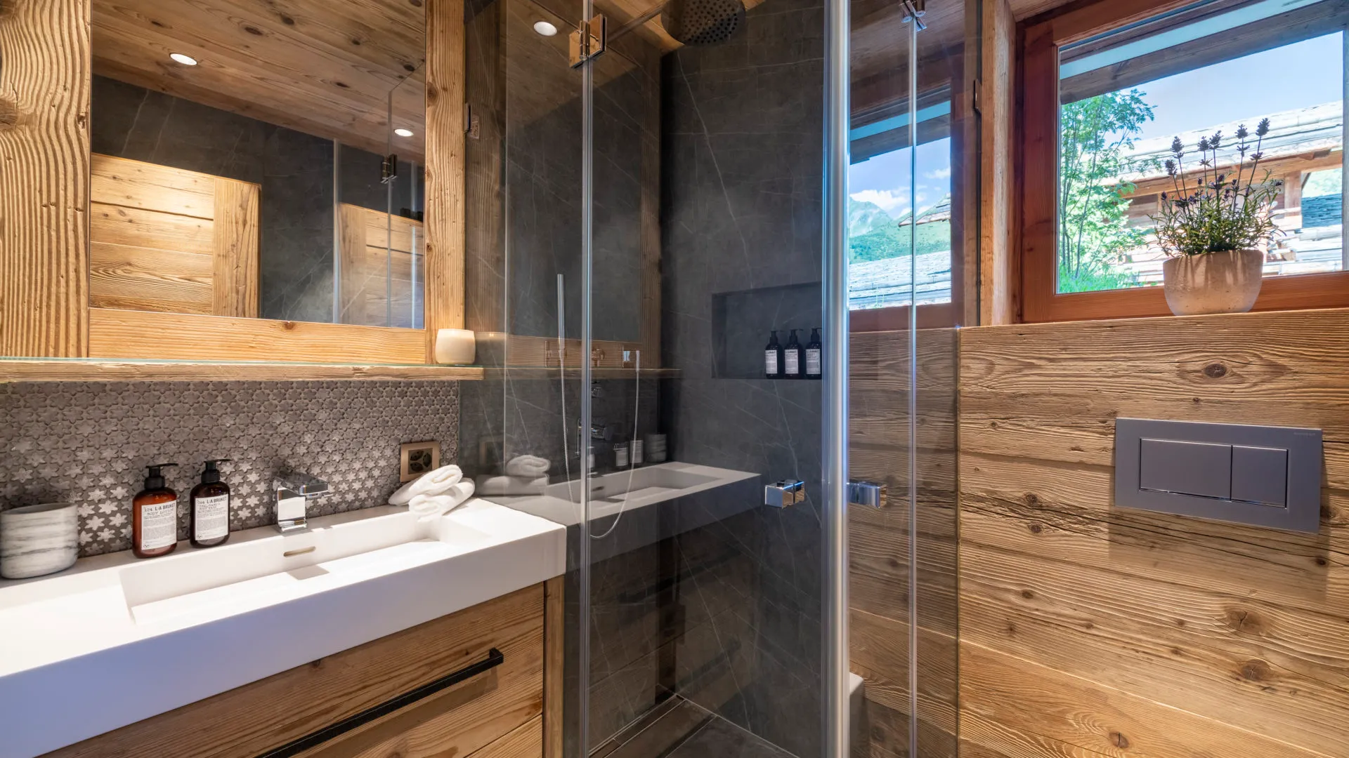 The chalet is spread over four floors which are linked by both staircase and lift. The front door opens at the second floor level which is the dedicated sleeping floor. Here there are four contemporary double bedrooms, all of which enjoy an elegant, minimalist style. Two of the bedrooms have access to the paved terrace outside. Tasteful embellishments, luxurious textiles and high-specification mounted televisions finish each room perfectly. All of the bedrooms enjoy an en-suite shower room and the master suite has a bath too.
