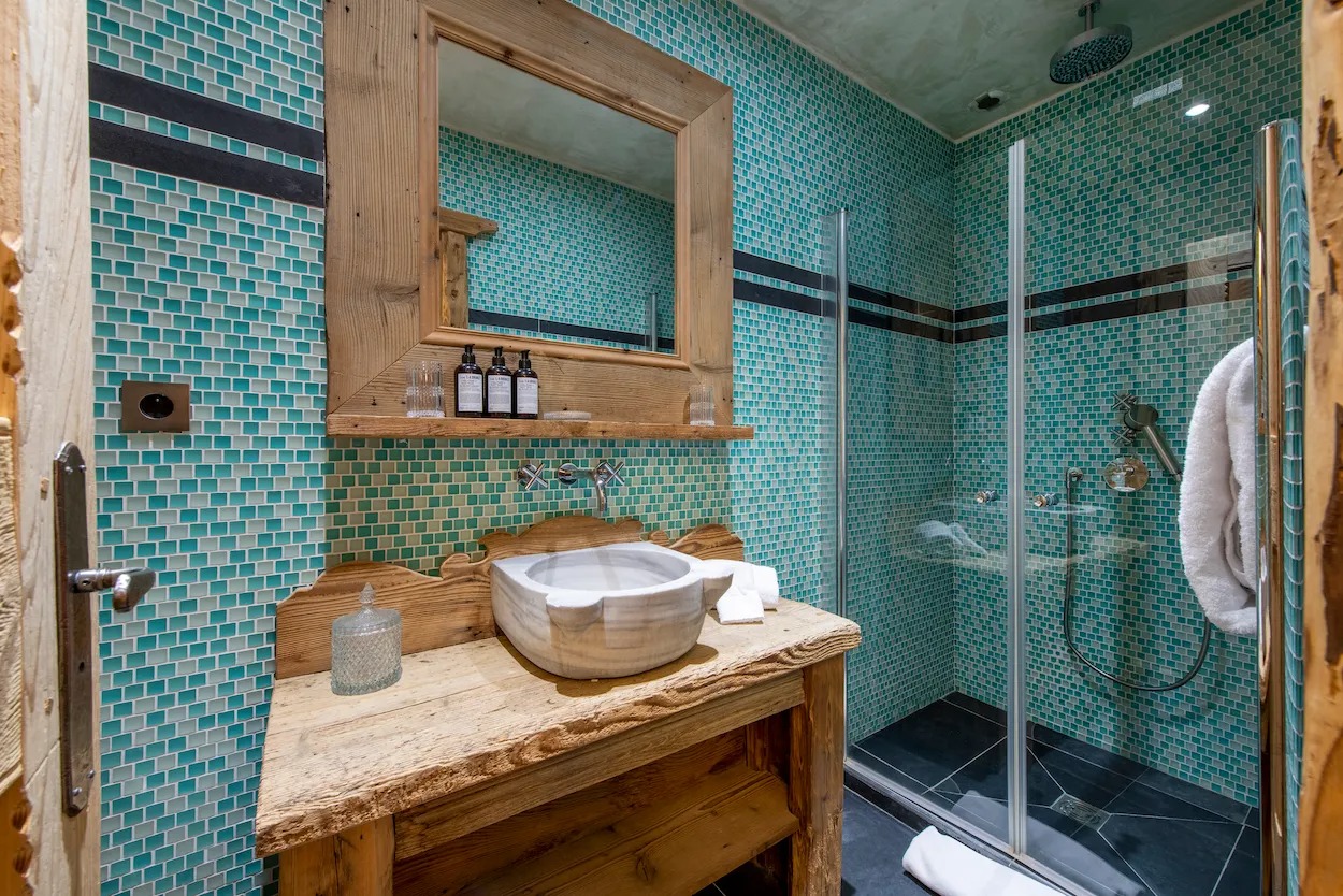 Down the staircase that winds around the stunning statement crystal chandeliers, you will find the sleeping floor. The plush master bedroom comes complete with a cosy seating area, floor-to-ceiling windows, access to the terrace, a beautiful white marble en-suite bathroom, and a unit at the foot of the bed which houses the retractable TV. The other two double bedrooms on this floor have wall-mounted TVs and their own shower rooms in the same marble finish, with one sharing access to the same terrace as the master. Each decorated in neutral, calming colours with lots of Alpine soft furnishings, you will wake feeling rested, refreshed, and ready for an exciting day on the slopes.