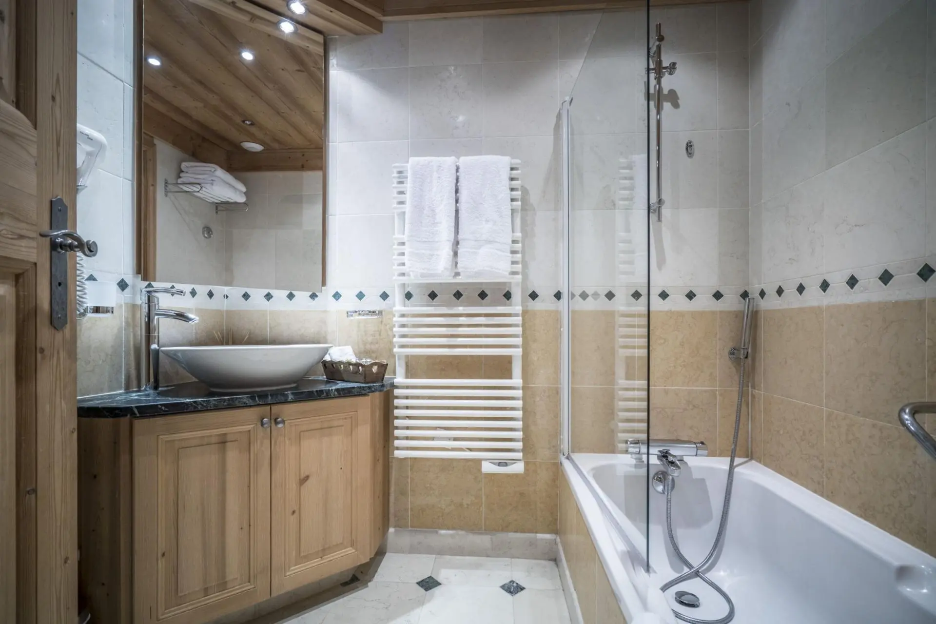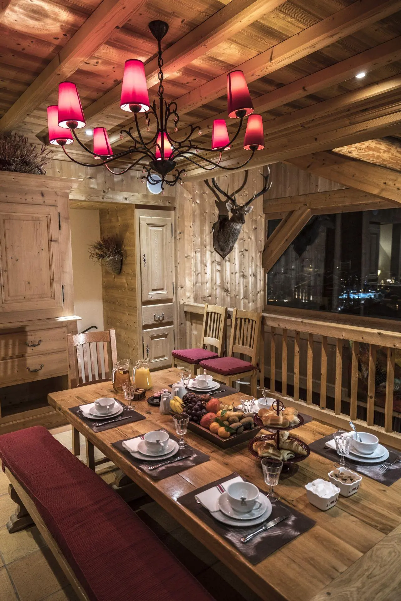 On the entrance level you will find the dining room, with terrace access, and a well-equipped kitchen. The terrace provides breathtaking views down the valley. The wine cellar, filled with a wide selection of French wine and champagne, is heaven for connoisseurs. A centralised audio system and a home cinema system provides the entertainment. You can also relax in the chalet’s hammam.