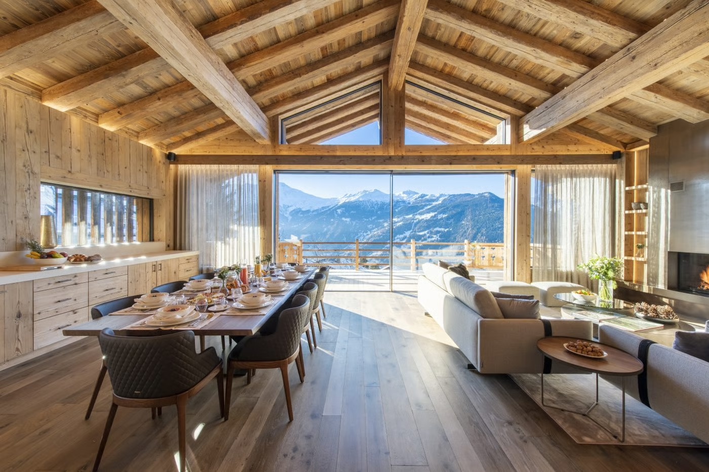 Floor-to-ceiling windows ensure the space is filled with light and allow you to soak up the sublime views from every angle, and sliding doors lead out to the spacious balcony with an outdoor table. At night, the village below is lit up, creating a wonderful ambience.