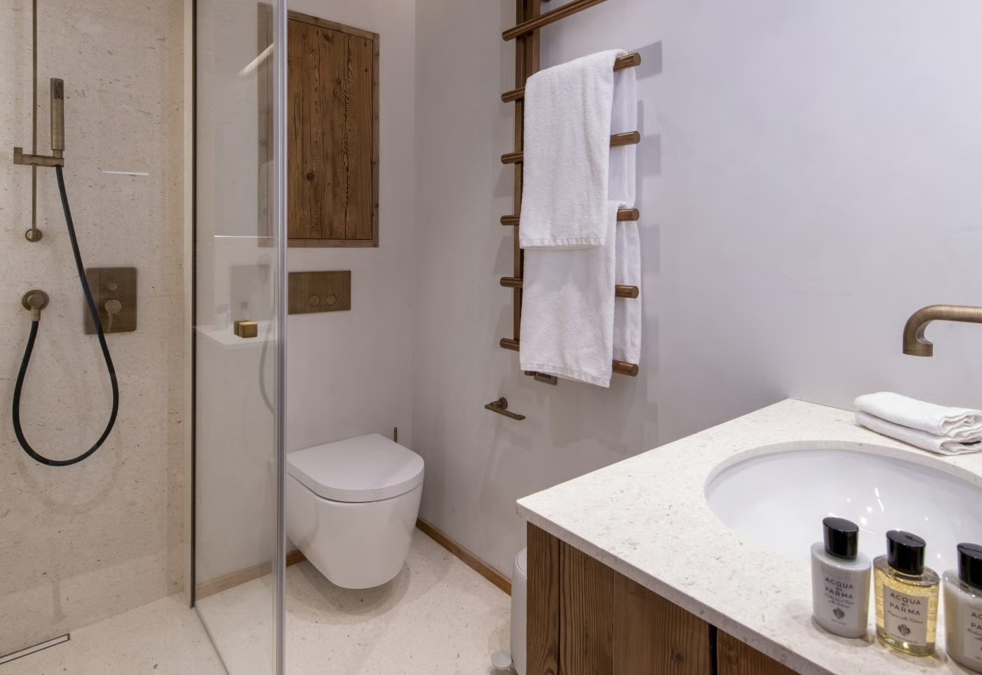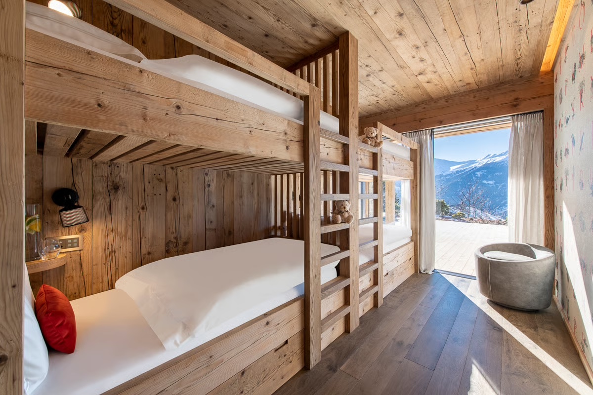 Located across the hallway are two beautifully finished en-suite bedrooms, one can be configured as a twin/double and the other is fixed double. Decorated in a paired back, zen style with large windows, generous storage, desks and tasteful light fixtures, these offer a haven for relaxation and will ensure you are well-rested for busy days exploring the mountain. The other bedroom on this floor is a quad bunk bedroom decorated in cosy alpine patterns and textiles, ideal for children.