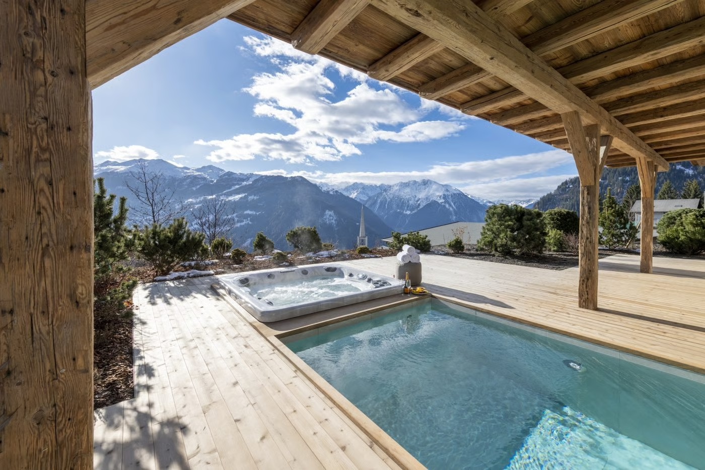 The chalet’s impressive spa is located on the ground floor, where the real ‘wow factor’ is provided by the indoor/outdoor swimming pool, where you can retreat to for some relaxation and rejuvenation after a day on the slopes. The chalet also boasts an outdoor hot tub which faces the vast and stunning mountainscape.