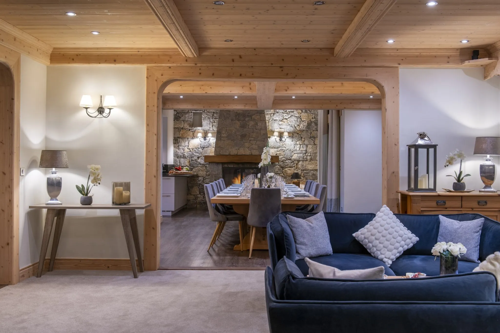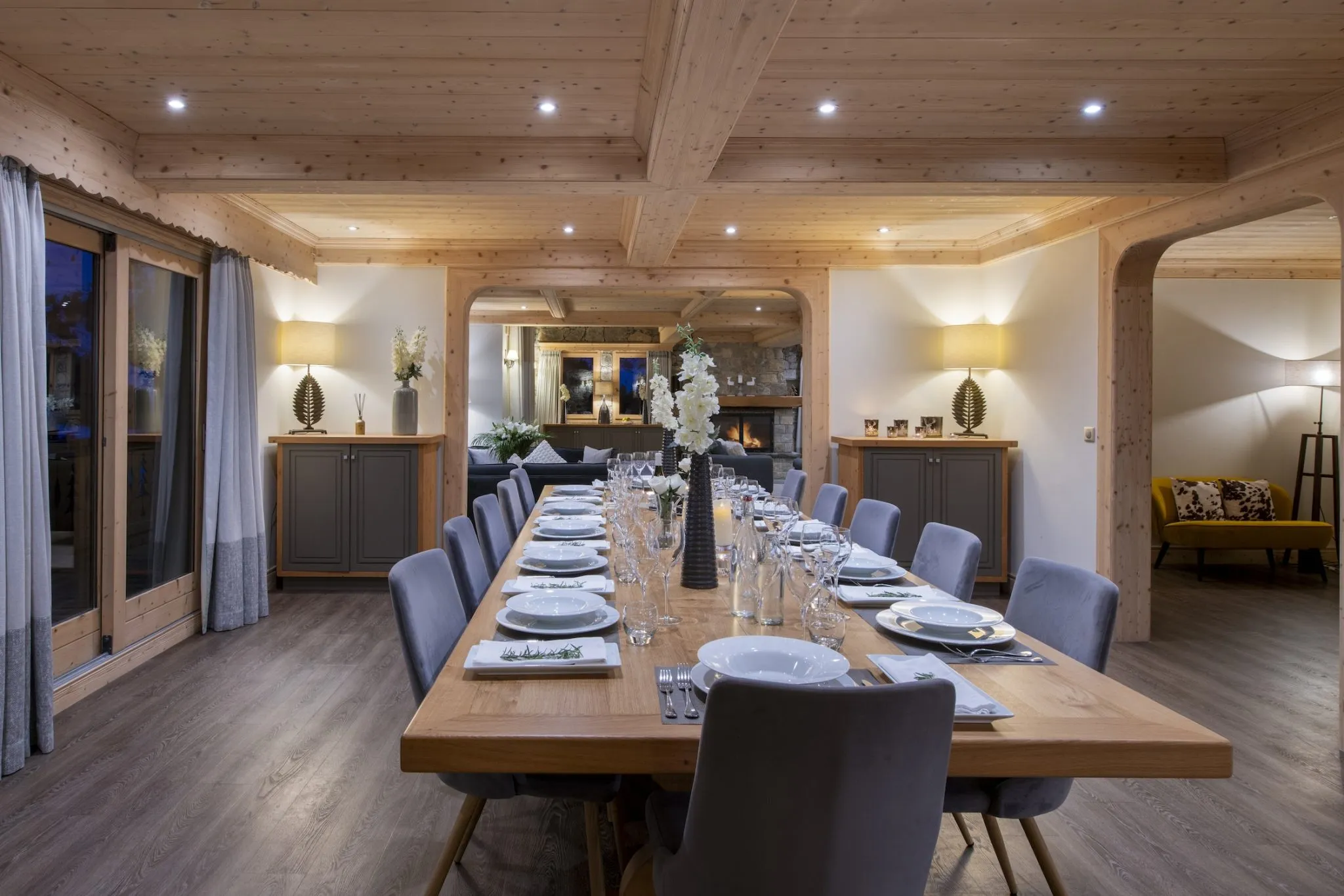 Ascend to the first floor where the heart of this luxury mountain chalet unfolds. The expansive living area centers around a magnificent wood-burning fireplace, embraced by plush sofas and flooded with natural alpine light. French doors open onto a wraparound balcony where morning coffee and starlit evenings become cherished rituals. The grand oak dining table seats twelve beside a second fireplace, while the adjacent fully equipped kitchen invites culinary exploration for self-catered flexibility or private chef experiences.