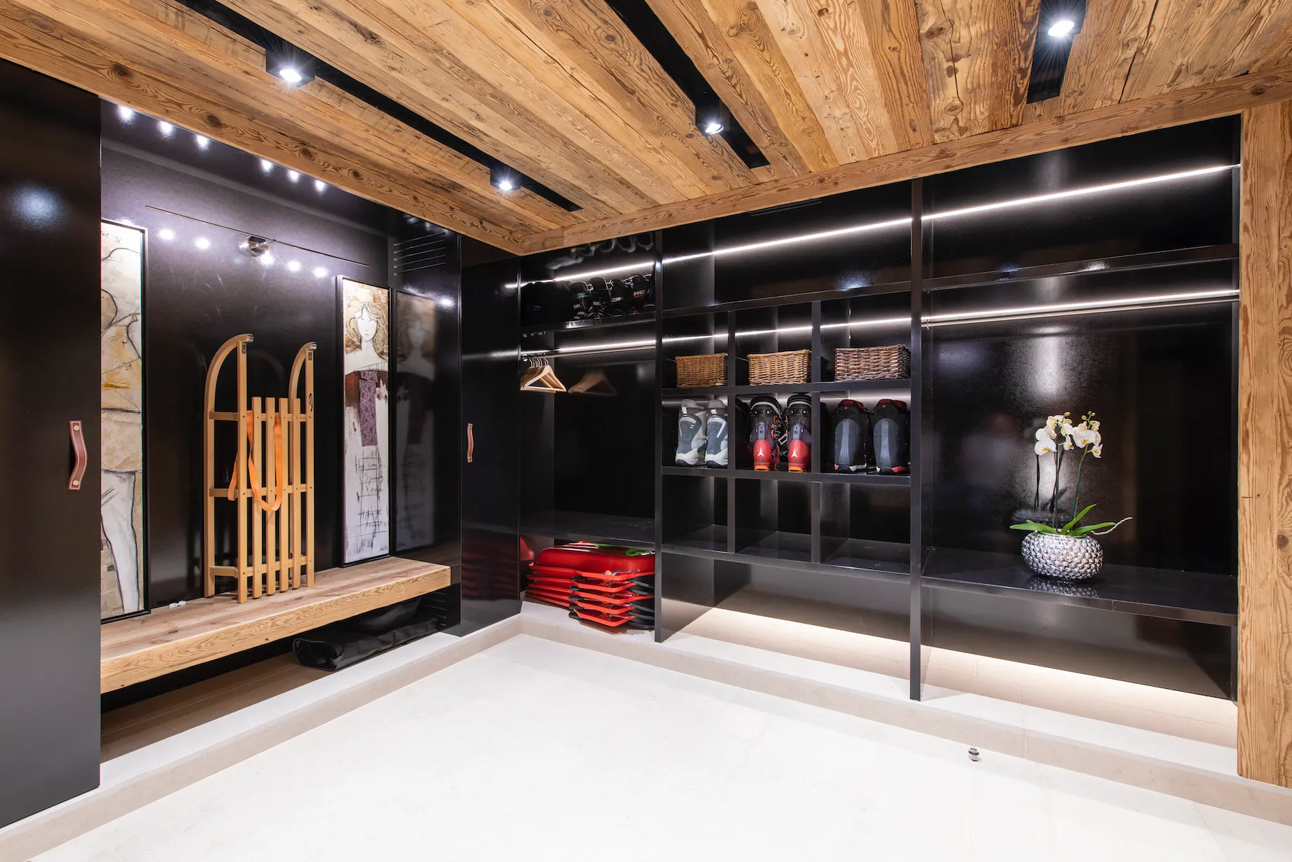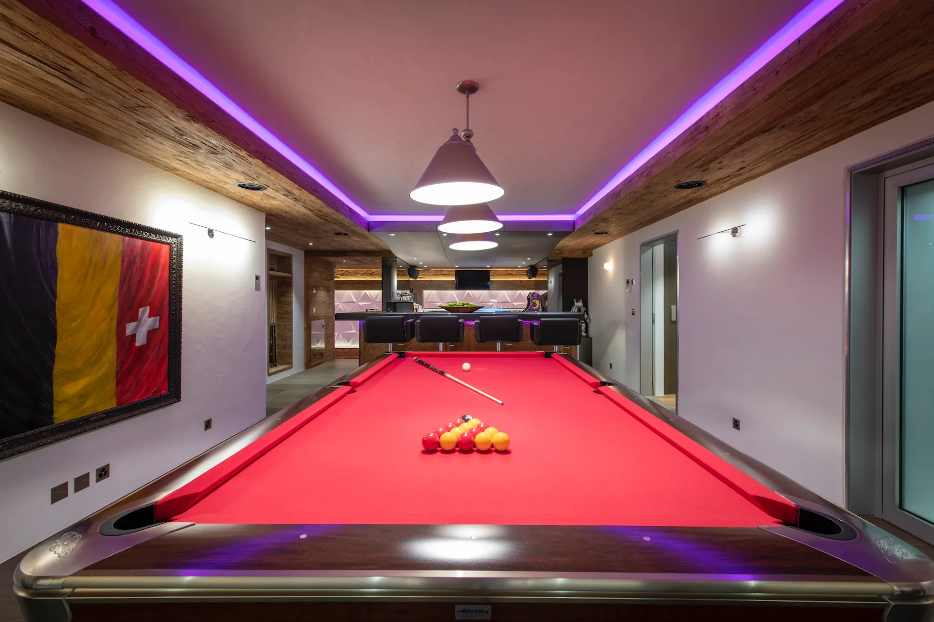 The entire ground floor in the main chalet is dedicated to entertainment. The focal point is a 17m indoor swimming pool set against floor to ceiling windows which have privacy blinds if desired. A floating stone path leads to the sunken outdoor hot tub where you can relax with the sensational views as a backdrop. You will also find a well-equipped gym, sauna, hammam, bar and billiards area, gaming room, poker room with panoramic wine cellar, games area, and an extraordinary bowling alley. There is also a large professional kitchen with service elevator on this floor.