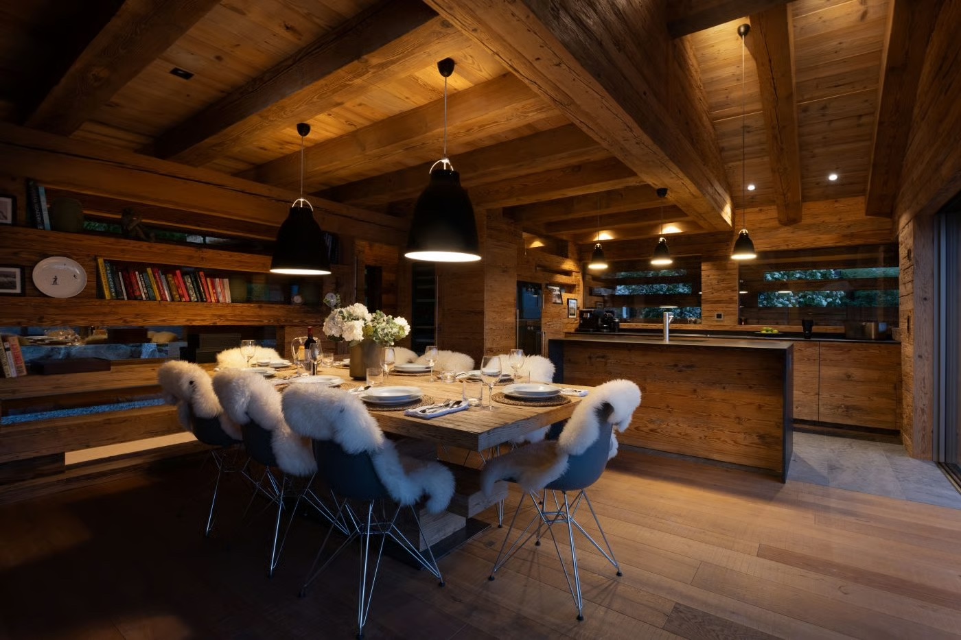 You enter the chalet into a beautifully open-plan living area, thoughtfully divided into a kitchen, dining space, and living room. At the heart of the dining area is a large wooden table seating 12, the perfect place to gather, whether you're enjoying a leisurely breakfast or watching the chef whip up a feast in the kitchen.