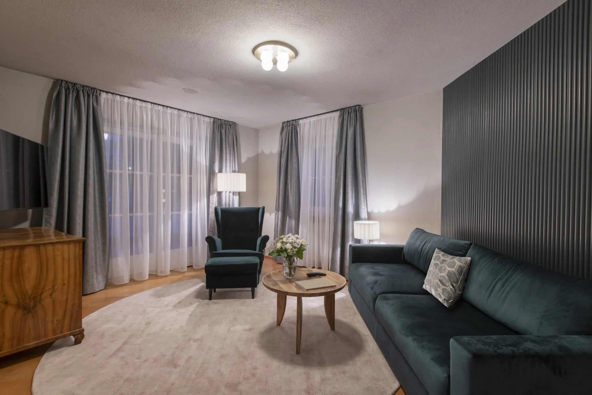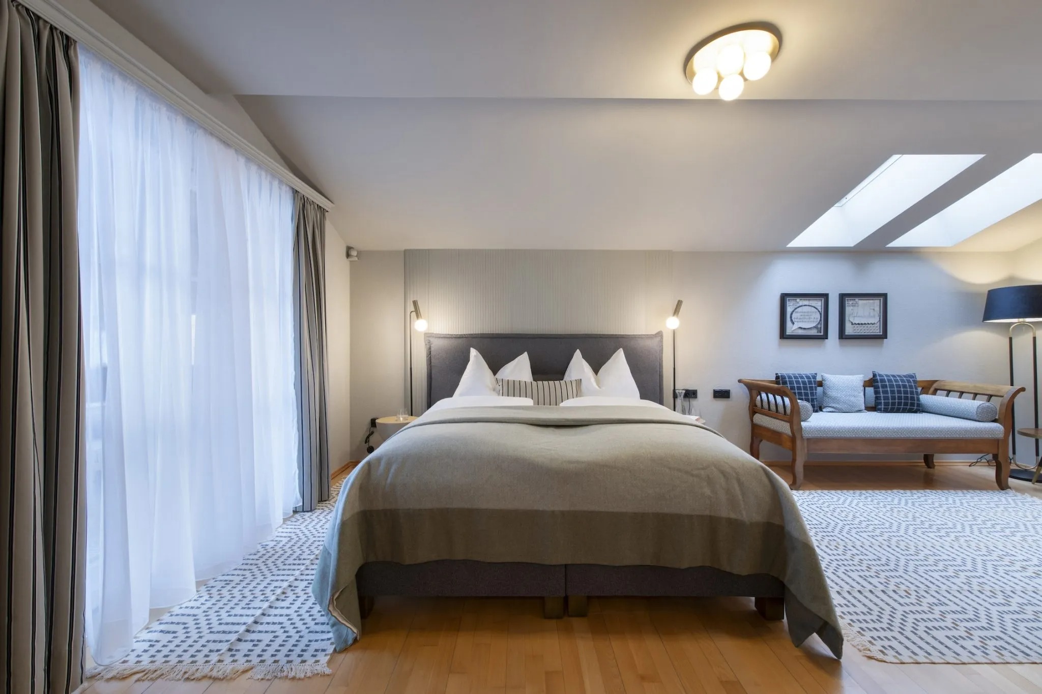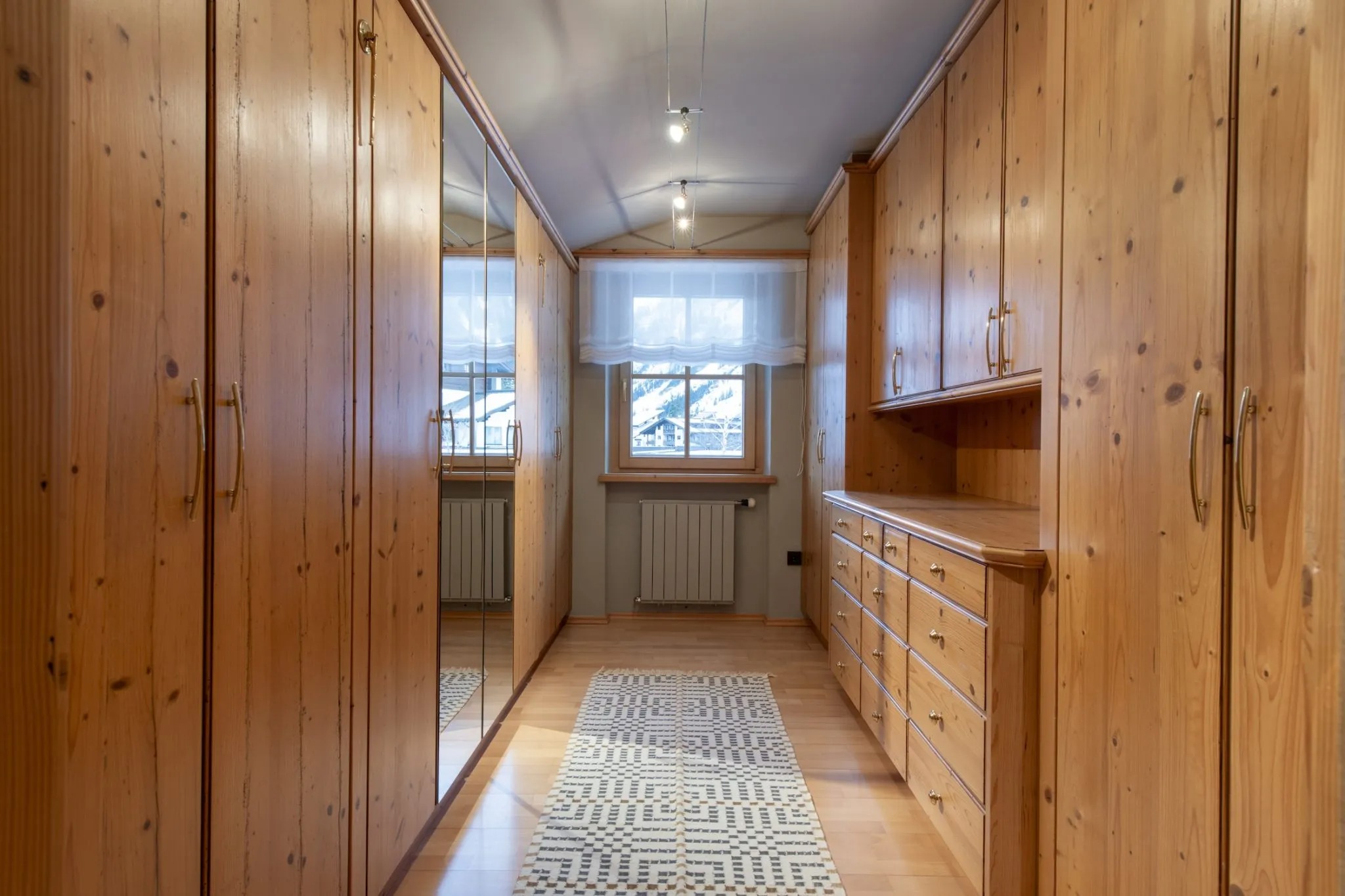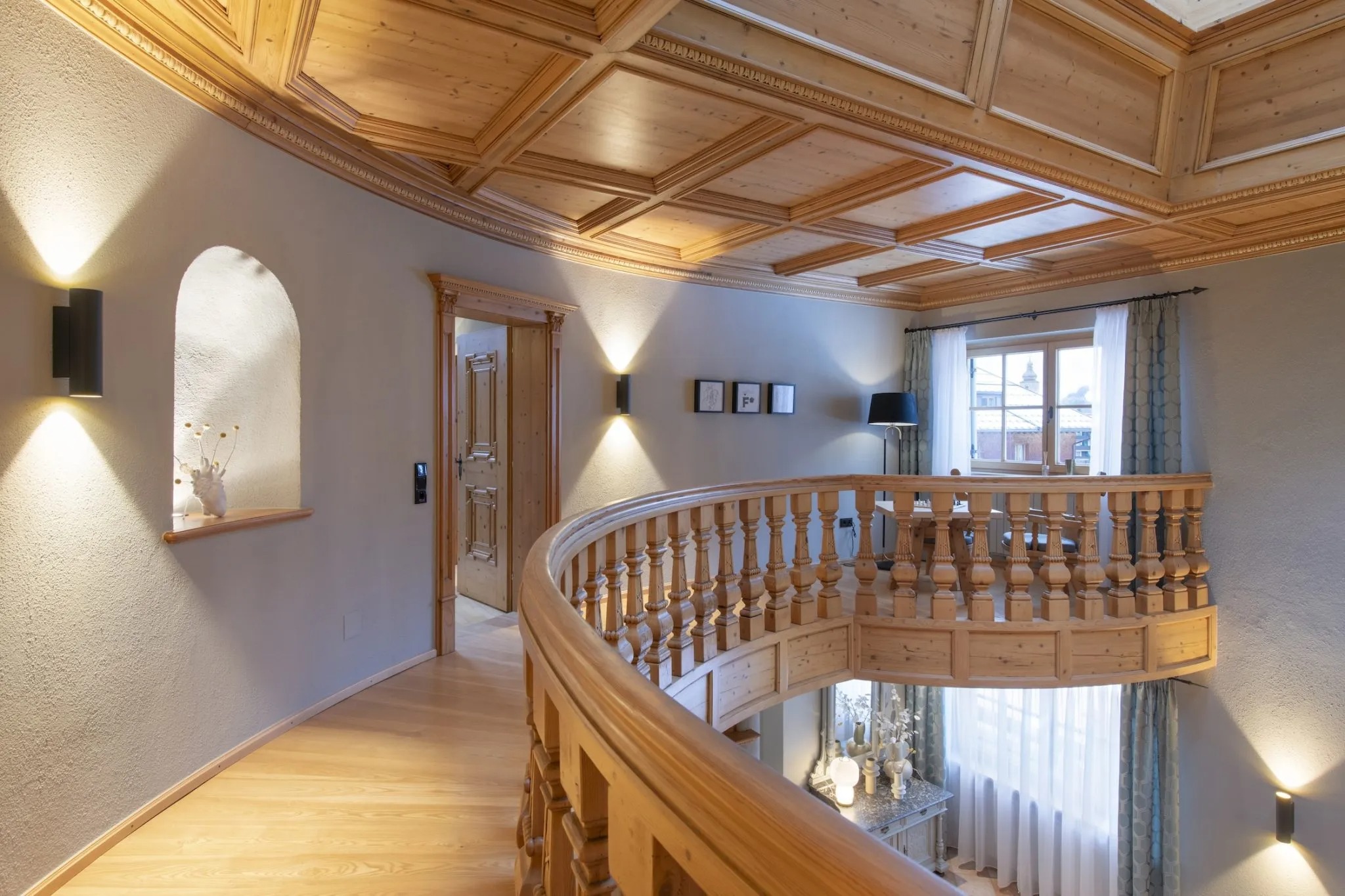 This area opens into the original Austrian Stube dating back to the 18th century, featuring a dining area which comfortably accommodates six guests. The property is built around this welcoming space, showcasing authentic craftsmanship with rich fabrics used throughout. After a day exploring Lech’s slopes, unwind by the traditional tiled stove, or sink into a cosy armchair with your holiday read. The well-equipped kitchen, which opens onto the terrace, provides everything you may need to craft delightful meals.