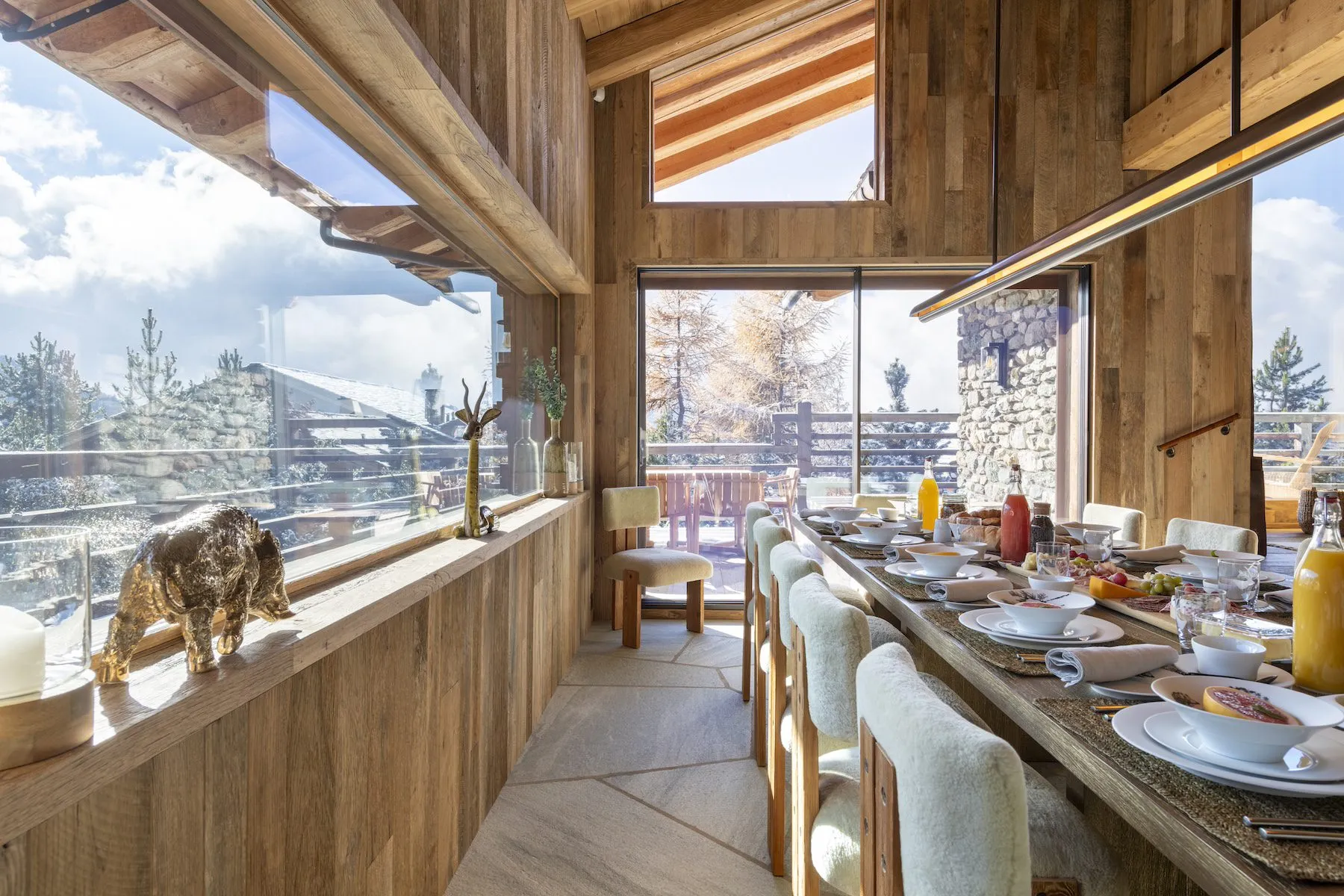 The living room seamlessly transitions into the dining area, where the impressive heavy oak dining table looks out onto the mountains, creating an inviting atmosphere for special moments. The kitchen is ingeniously divided into two parts. One segment is a bustling hub for culinary creations; this section can be closed off, providing a space where private chefs can whip up a storm in style. The other part offers a sociable setting for early evening drinks or relaxed breakfasts around the kitchen island.
