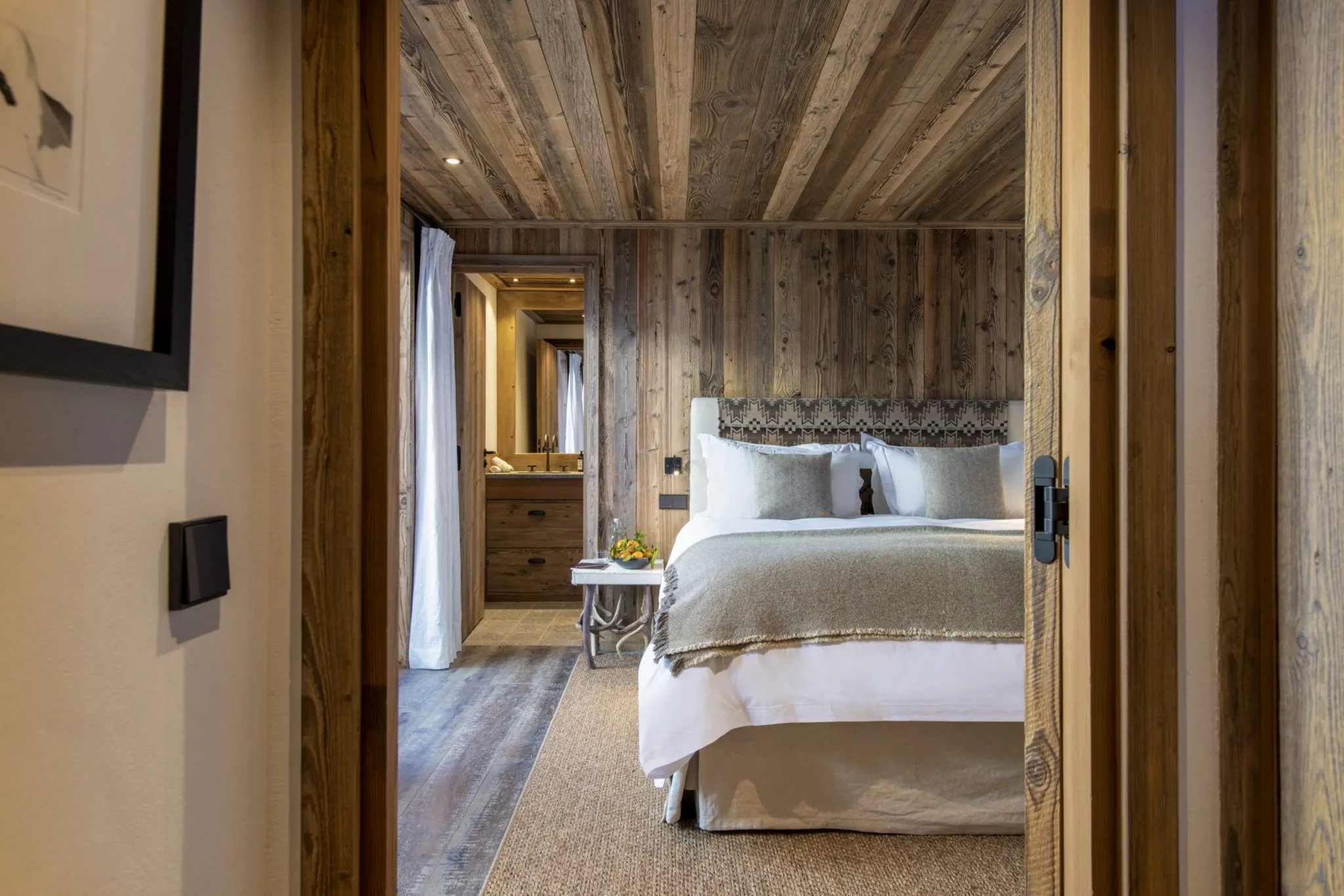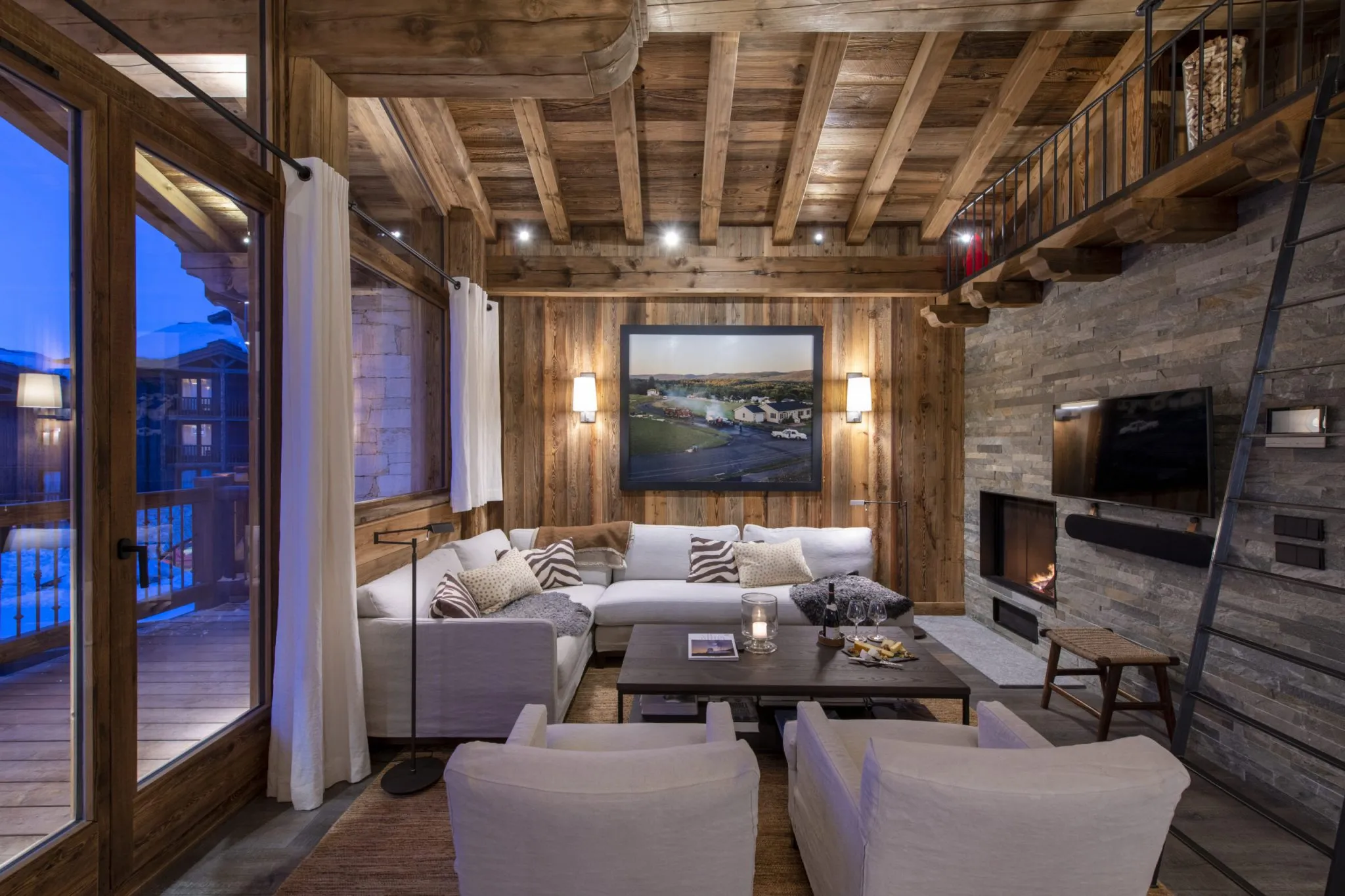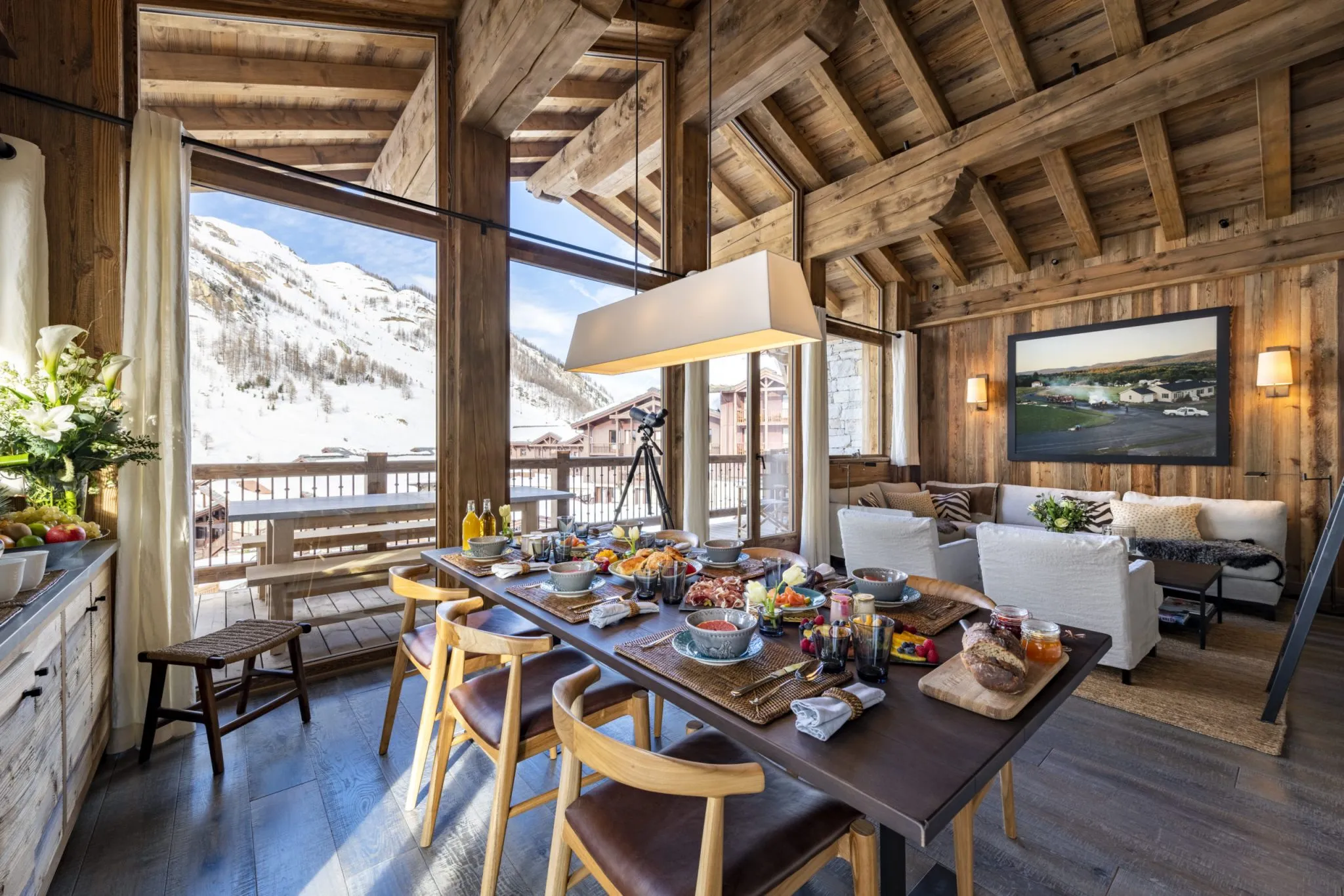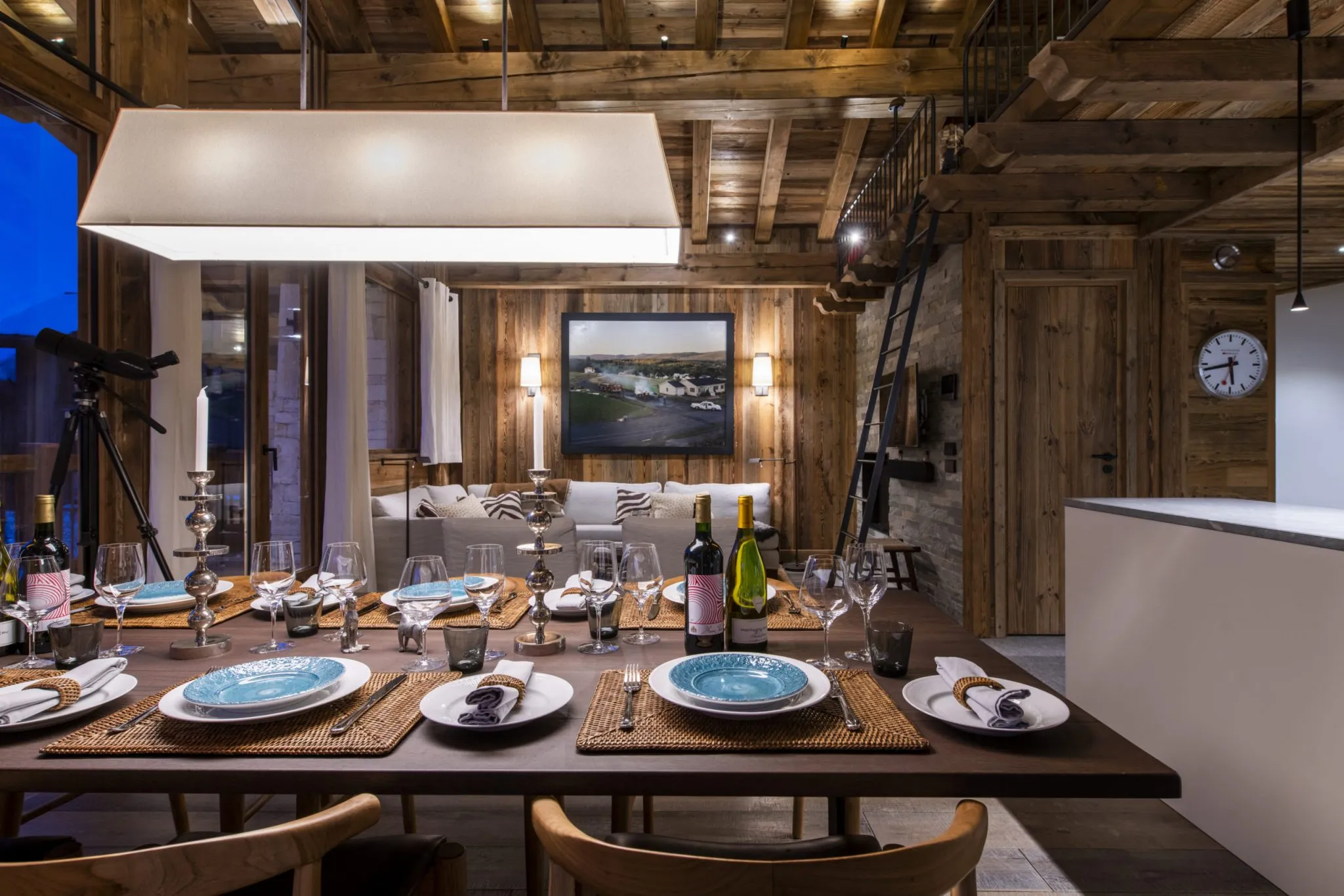 Reclaimed wooden walls and ceilings ensure the space is warm and timeless. A ladder leads up to a cosy library at the mezzanine level. The sophisticated living area, with a plush and inviting L-shaped sofa and arm chairs, is the perfect place to relax and indulge in the stunning views. A wood-burning fireplace is built into the wall where there is a large screen TV too. Step out through glass doors onto the wide balcony and enjoy an apéro in the fading embers of the day. The living area flows into the generous dining area where the table seats up to eight guests. This area is looked over by a sleek modern kitchen, fully equipped for catering.