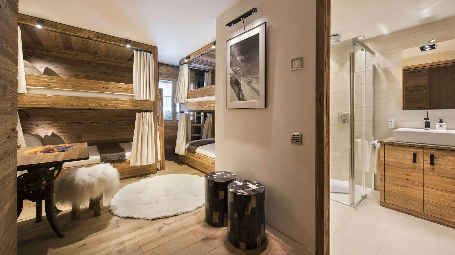 The open plan sitting room and kitchen has large picture windows that give panoramic views of the alpine garden which can also be admired from the sunny south-facing terrace. All three bedrooms have ensuite bathroom rooms. One of the bedrooms is a bespoke quad bunk room which is ideal for kids.